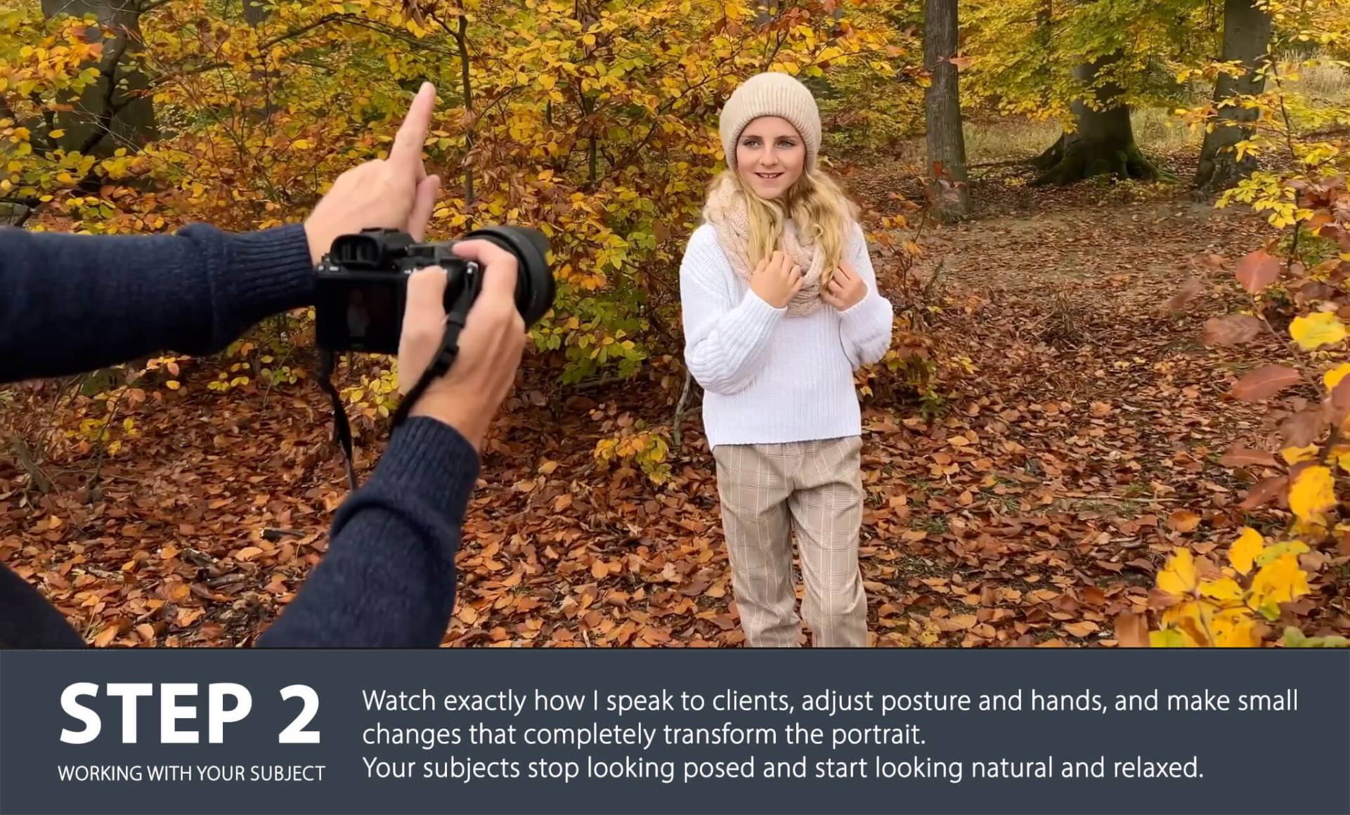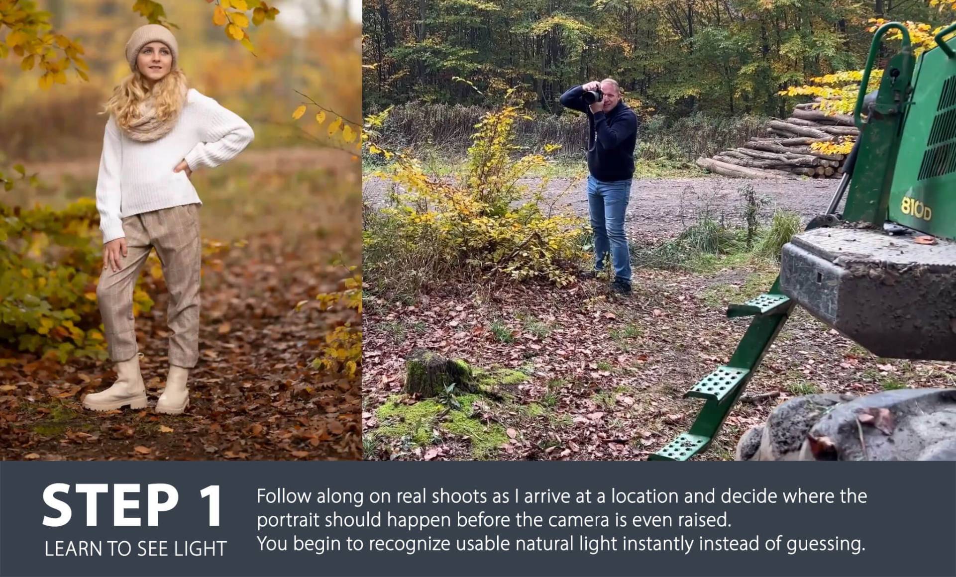 You follow real portrait sessions with me from the very first decision — choosing a location and reading the light —